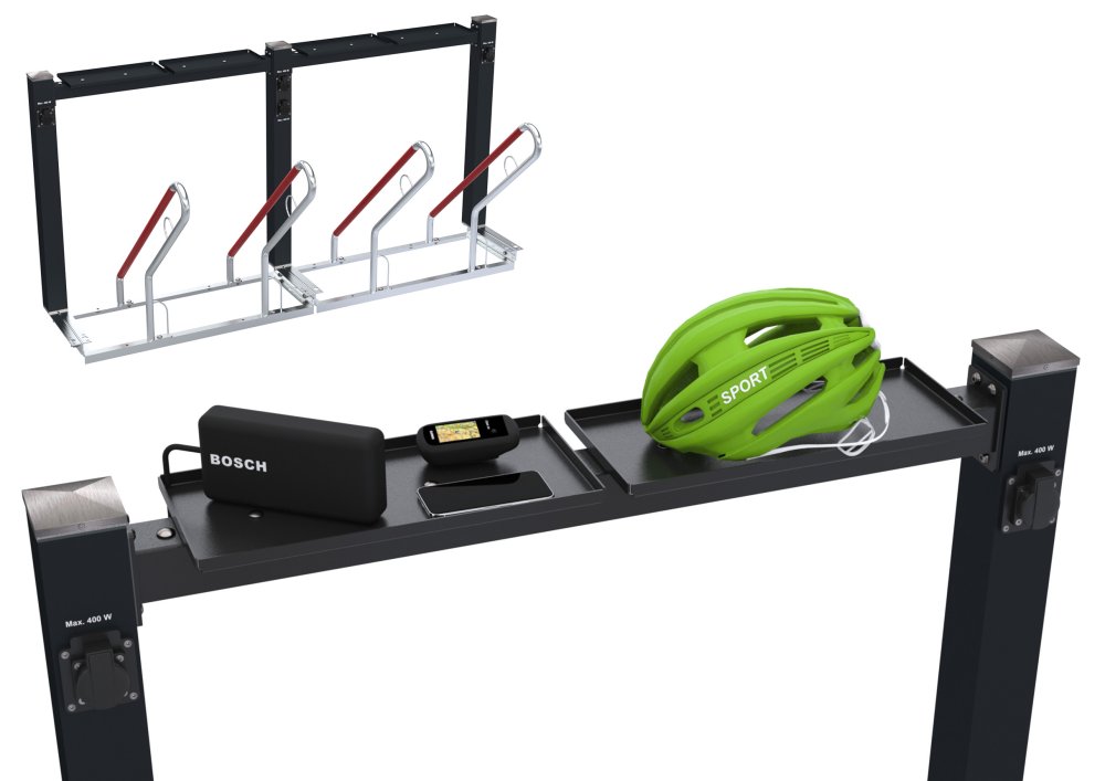 Robustní ocelová konstrukce se čtyřmi integrovanými venkovními elektrickými zásuvkami pro umožnění nabití elektrokol a příslušenství, jako mobilní telefony nebo navigace.