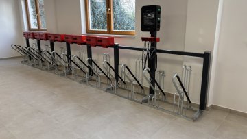 - 10 uzamykatelných nabíjecích boxů s 230 V zásuvkou pro baterie elektrokol