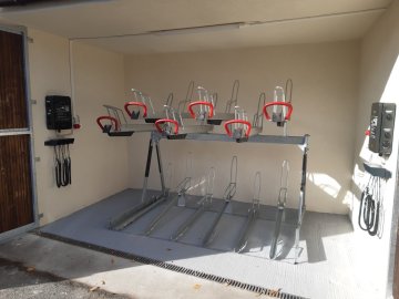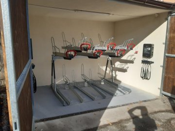 • uzamykatelné skříňky s integrovanou el. zásuvkou 230 V, nabíjecí stanice s integrovanými kabely